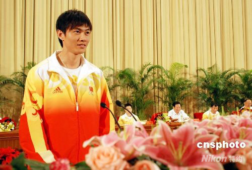 第29屆奧運會男子佩劍個人冠軍仲滿在報告會上發言。中新社發 楊慧峰 攝