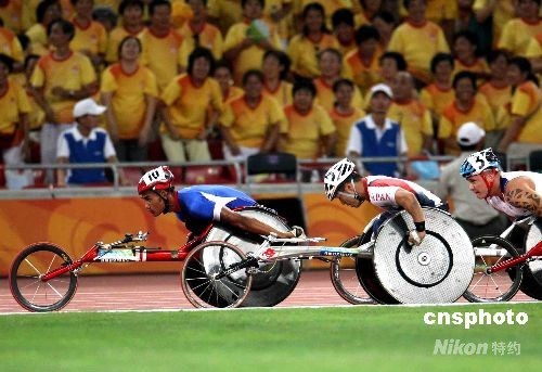9月11日晚,北京殘奧會田徑比賽繼續在奧林匹克公園內的國家體育場“鳥巢”舉行,在男子5000米-T54級決賽中,泰國選手巴越·沃霍倫一路領先,并在最后時刻頂住各路選手的反撲,在這個一直被歐美強手統治的項目中奪得冠軍。中新社發 任晨鳴 攝