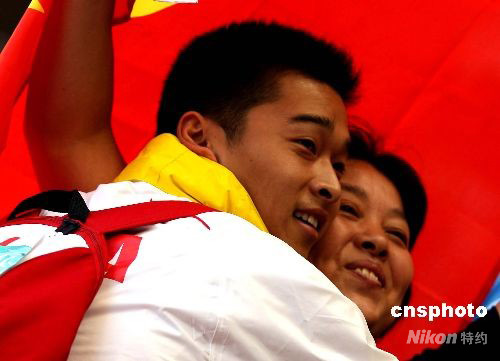 9月11日,在男子鐵餅F35-36級決賽中,F35級中國選手郭偉以54米13獲得1131分奪得金牌,并打破世界紀錄。獲得勝利的郭偉與在場觀戰的媽媽擁抱慶祝。中新社發 任晨鳴 攝