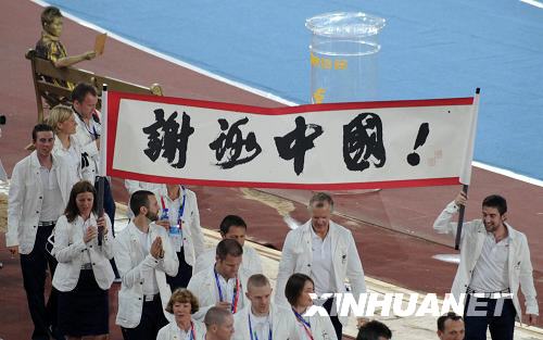 英國(guó)代表團(tuán)舉著“謝謝中國(guó)”的橫幅進(jìn)場(chǎng)。新華社記者 韓傳號(hào) 攝