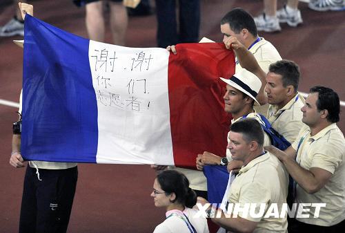 法國(guó)代表團(tuán)舉著寫(xiě)有“謝謝你們志愿者”的國(guó)旗入場(chǎng)。新華社記者 朱崢 攝