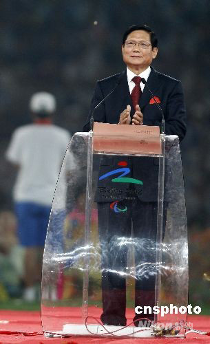 9月17日晚,北京2008年殘奧會閉幕式在國家體育場舉行。圖為北京奧組委主席劉淇致辭。中新社發(fā) 杜洋 攝
