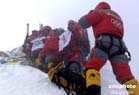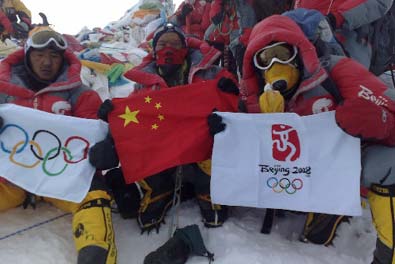 北京奧運圣火成功今天上午9時許登上珠峰,登山隊員們在峰頂進(jìn)行了火炬接力,接力活動結(jié)束后,隊員們在世界之巔展示熊熊燃燒的祥云火炬以及中國國旗、奧運五環(huán)旗和北京奧運會會徽旗。