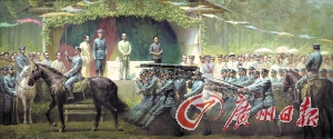 對于潘嘉俊來說,他的黃埔情結似乎更加濃烈些,21年的軍旅生涯讓他對軍事題材的創作格外有激情,“我熟悉黃埔軍校,并畫過有關的連環畫、單幅油畫和肖像畫”,他說,至今尚未出現一幅表現黃埔軍校歷史的大型美術作品,同時,“人們記憶中關于閱兵的場景作品也極少”,因此,“另辟蹊徑、獨樹一幟”成為潘嘉俊選題的立意。