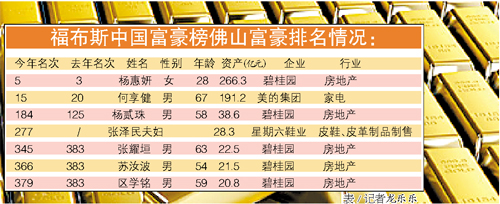 對比20天前剛剛發布的胡潤富豪榜,在佛山富豪方面,新的福布斯排行榜表現出了上榜人數少、富豪身家縮水的特點。例如楊惠妍在胡潤榜上顯示的財富是330億元,而福布斯顯示為266.3億元,而何享健的身家也縮水4億元。此外,格蘭仕梁德慶、金盛盧氏等在胡潤榜單中有優秀表現的本地富豪在福布斯中卻不見蹤影。