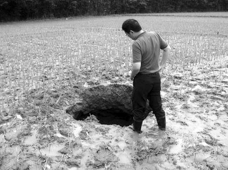 懷遠(yuǎn)鎮(zhèn)政府工作人員尹波也證實(shí)說,因?yàn)椴逖碜訒r(shí)向田里灌水,泥土經(jīng)過浸泡后引起了地面的塌陷。