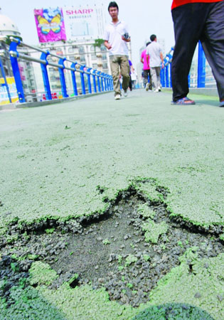 記者問(wèn):天橋剛修成僅一個(gè)多月,為何會(huì)出現(xiàn)大面積破損現(xiàn)象。張成立說(shuō),該路段交通異常擁堵,天橋工期趕得非常緊!坝捎谛腥艘^(guò)橋,影響了施工,所以上面本來(lái)要噴的一層固化膠就缺少了,以致地墊黏合性差,F(xiàn)在,我們要在上面再?lài)姽袒z!