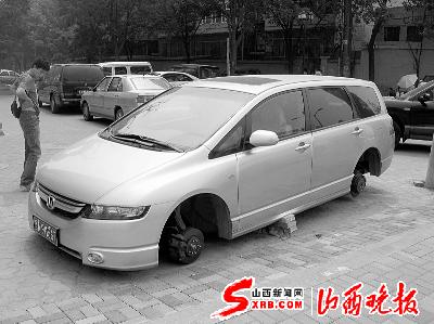 今天(17日),太原市和平北路與漪汾街附近,一輛停在路邊的本田商務(wù)車引來眾多市民圍觀。這輛車的4個(gè)輪子全被卸掉,無法行駛。