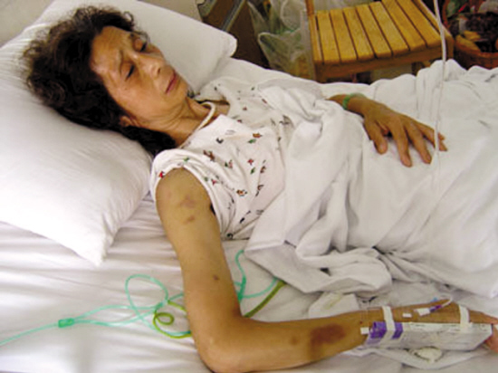 據該帖描述,陳玉蓮頭上、身上、胳膊上、腿上遍布傷痕。診斷結果是,她被打成腦震蕩,軟組織挫傷幾十處,左腳功能障礙,植物神經紊亂……她躺在病床上,渾身哆嗦,嘔吐腹瀉不止,發燒幾天,身心受到了重創。陳玉蓮的妹妹陳翠蓮昨晚接受羊城晚報記者采訪時說,陳玉蓮剛打過針,因腦震蕩影響,正在病床上昏睡,而她左腳至今無法踏地。