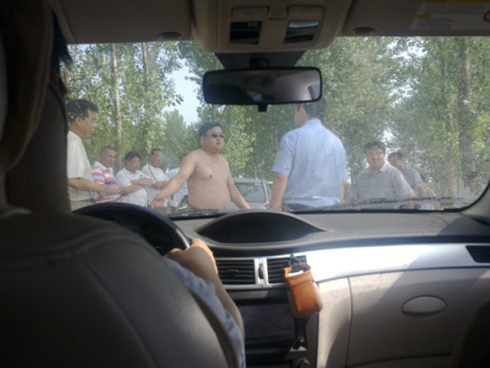 當央視記者行至幾公里外的東狼城崗村時,一輛車號為豫AEP676的車跟了上來,此輛車之后還跟著兩輛黑色轎車。央視記者的車慢,后邊的車也慢,央視記者的車停,后邊的車也停。