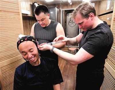 王躍(左一)在模擬艙內進行腦電極試驗。俄羅斯生物醫學問題研究所供圖