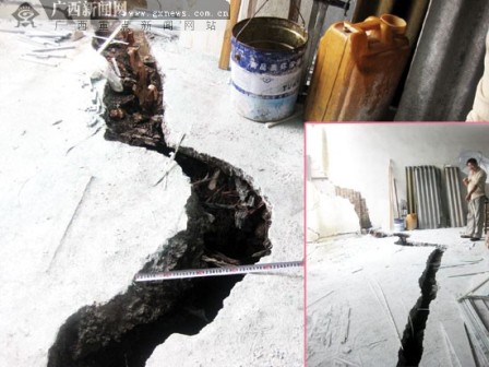 位于南寧市二塘大盤嶺的南寧新城福利五金總廠,因受這兩天大雨的肆虐,使得該廠建材車間地板突然開裂,出現(xiàn)了一條從車間的圍墻裂起一直延伸至地面80多米長、有些地方寬約60厘米的大裂縫,使人看得觸目驚心。