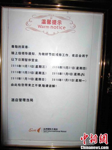 在四星級的臺州國貿飯店大堂,記者看到一張通知:接文廣新局通知,本市娛樂行業將要進行節能減排輪休,因此本飯店(KTV)在10月25日、11月2日、11月10日、11月18日暫停營業。