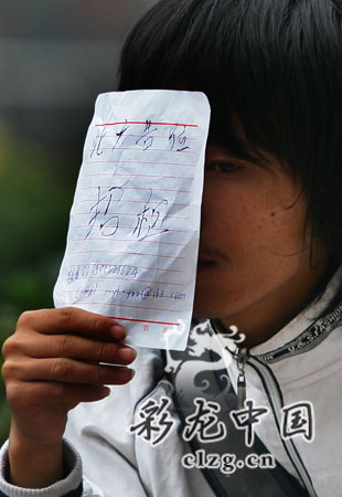 羞澀的表情,略亂的頭發,穿一身白色衣服,旁邊擺一個旅行包。這個臉上還有著稚氣的小伙子,用蹩腳的普通話指著紙上的字,有些不好意思地說:“寫得很不好。”手舉一張紙遮住臉,上面是他自己用鋼筆寫的“此廣告位出租”6個大字,右下角留的小字標有自己的QQ號和電子郵址。