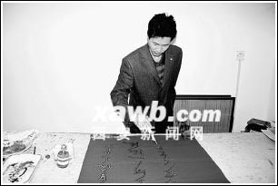 據王璽介紹,他自幼酷愛書法,2004年在西安學習期間,參加了由省政協組織的書畫活動,他見書畫名家雷長安表演的書法針筆運筆剛柔相濟,結字嚴謹多變,布局渾然大氣,風格酣暢灑脫,便產生了針書創作的念頭。今年,他積極摸索,利用醫療器械注射器作為工具作筆寫字,將調和的裝飾材料溶液吸到針管里,蘸到“筆尖”上,使金墨銀墨在深色宣紙上流動成為書法作品,如同毛筆在生宣紙上寫字一樣有節奏、有韻律,極具觀賞性。 (記者張松)