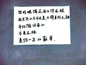 孫女士說,她看了紙上的幾行字后,不知何故,詢問后得知,原來鄰居何女士前天晚上將孩子的衣服洗完后,晾在門外的胡同里,夜里忘了收回來,第二天早上出門一看,幾件較好的衣服全不見了。何女士又氣又郁悶,便想寫一首小詩來抒發憤懣的心情。“我這個鄰居是一家公司的職員,喜歡文學,平時總愛寫幾首小詩抒發情感。”孫女士說。