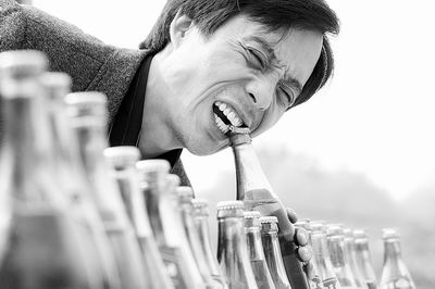 “開始!”宋老板發出命令后,胡耀輝左手抓起啤酒瓶,輕輕一咬,瓶蓋已經含在嘴里。白白凈凈的胡耀輝沒有一點面部表情,輕松得就像喝涼水一樣。