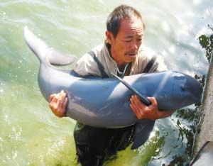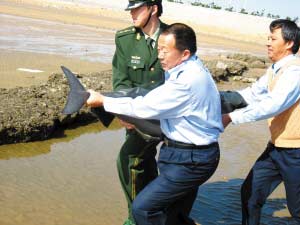 昨天上午,膠南市開發(fā)區(qū)管委兩河村村民王先生到海邊買魚時,發(fā)現(xiàn)漁船捕撈上來的一條1米多長的小海豚被一魚販買去,聽到該魚販要將海豚轉賣給酒店時,王先生立即出千元高價將這條海豚買回,然后養(yǎng)在自家的蝦池里準備放生。昨天上午11時,在膠南市漁政部門的見證下,這條小海豚被放歸大海。