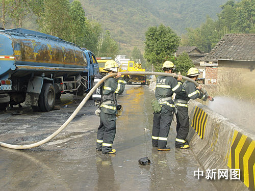 新豐縣公安局副局長陳如鋒組織交警很快封鎖了現場,實施交通管制。消防官兵穿上防化服,用兩臺消防車從河里抽水,用射水槍噴射側翻的槽罐車,迅速稀釋從車上流出的液體甲醛。吊車隨后趕到,工作人員帶上口照,冒著生命危險,靠近槽罐車,將側翻的槽罐車吊起,消防官兵繼續用射水槍向槽罐車猛烈射水。