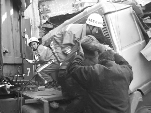 救援人員對(duì)被困車(chē)內(nèi)的司機(jī)進(jìn)行解救。馬威 攝