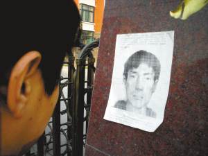 昨日,在邢臺街頭,仍張貼有帶畫像的系列強奸案通緝布告。 褚朝新 攝