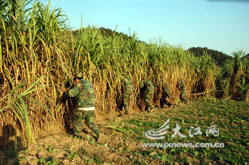 昨日下午3時許,由數十名德興市武警戰士、上饒市特警、德興公安民警以及民兵等人員組成的搜捕隊再一次來到付家墩,他們對付家墩村村后的百畝甘蔗進行了全面搜查。