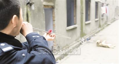 無奈之下,警察們只好分頭堵截,采取迂回靠近方法。半個多小時后,終于將這條流浪狗堵在小巷內。“好機會!”賈世釗不慌不忙地將麻醉針管裝入不銹鋼空心管中,在5米開外對準白狗輕輕一吹。只見麻醉針管在空中劃出一條曲線,擊中流浪狗脊背,但遺憾的是針管歪向了一邊。受驚后的白狗企圖逃跑,賈警官立即吹出了第二針,這下針管穩穩地扎進了白狗背部。一秒,兩秒……幾秒鐘后,白狗開始搖晃,接著便軟軟癱倒在地。