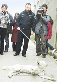 在準備拆遷的居民區中,一條白色流浪狗正啃著一塊從垃圾堆里翻出來的骨頭。見有人來,它撒腿就跑。這時,成都市錦江公安分局治安科民警拿出一根約1米長的特制鋼管,瞄準狗身輕輕一吹,麻醉針拋出優美的弧線,扎進了狗后背……昨日起,成都市公安局在全市范圍內集中開展一場整治街頭流浪狗的專項行動,走上街頭對城市的流浪、敞養犬只進行整治,人性化的捕犬麻醉吹管在行動中大顯神威。