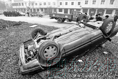 民警在國(guó)道上查車,追趕一輛轎車1000多米后,把轎車擠翻。司機(jī)在車?yán)锖熬让窬瘏s不管不問(wèn),直接離開(kāi)。上百名群眾氣憤不已,堵截肇事警車。