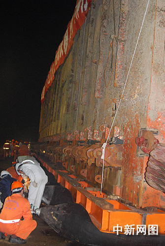 在氣囊上拉移的沉井,工作人員隨時檢查氣壓