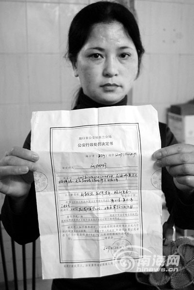 劉女士的“行政處罰決定書(shū)”這樣寫著,2007年12月21日22時(shí)許,在?诿捞m區(qū)板橋路無(wú)名麻將館內(nèi)參與賭博,根據(jù)治安管理處罰法規(guī)定,對(duì)你收繳賭資二十元,治安罰款伍百元。