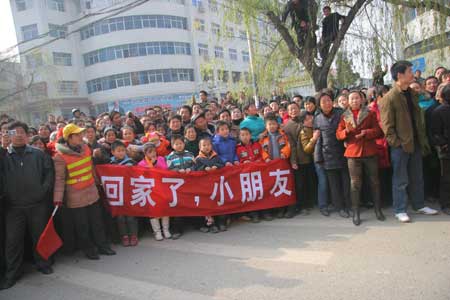11時,一個由近20輛車組成的車隊從賓館出發到高速路口迎接孩子。看到車隊出來,人群讓出通道。擠在人群最前面的是淅川縣的部分小學生。他們舉著小旗、拍起巴掌,拉起條幅“小朋友,歡迎你們回家”。