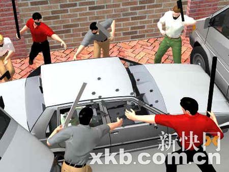 據(jù)自稱在遠處目擊了事發(fā)經(jīng)過的市民稱,當(dāng)時前后兩車內(nèi)沖出6名蒙面男子,其中兩人手拿利斧、兩人手持砍刀、兩人拿著木棍。拿斧頭的兩男子對著豐田轎車的輪胎一陣亂劈,將輪胎砍破,拿木棍的男子則對著車窗玻璃猛擊,車窗玻璃被敲碎,另兩名男子拿著砍刀架在了車內(nèi)人員的脖子上。