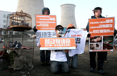 一名大學生穿著短袖,頭上戴著“貓咪”面具,身前放著一個“替動物請命”的牌子跪在馬路上,一個女孩舉著印有“拒吃貓狗肉”的T恤衫跪在他旁邊。他們身后,幾名學生拿著“善待生命、刀下留情”的廣告牌陪同,學生們在瑟瑟的寒風中“為動物請命”,這是昨日發生在鴿子市場的一幕。他們希望用這種方式感染那些虐殺動物的商販,讓商販們放下“屠刀”、珍愛生命。