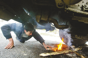 不遠處,一輛大貨車滑出了公路,而更多的貨車被困雪地。“貴C08649”貨車司機任江虎將引擎蓋揭開,在發動機下升起一堆火:“發動機被凍住了,必須把它烤化。”任說,13日晚路過此地回貴州,遇大雪封山,于是停下等待至今。和任一道的還有六七輛車,司機也都在車頭下升火烤車,形成一道奇怪景觀。