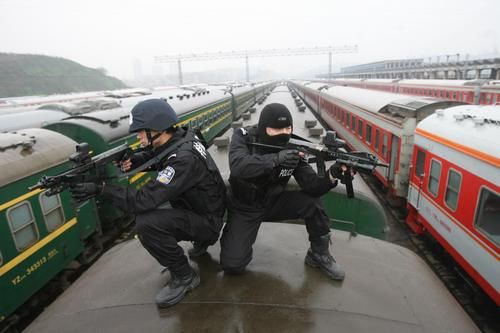 08年1月22日,重慶北運用車間的火車車頂,全副武裝的重鐵公安特警進行“處突”演習