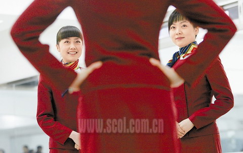 挺胸、抬頭、收腹、頭頂書,保持身體平衡,不讓書掉下來,一站就是幾個(gè)小時(shí)。這就是空姐在飛乘中保持良好體態(tài)的秘訣。“好苦哦,一站就是半天,兩腿僵硬得路都不會走了。前幾天的訓(xùn)練中還有三名同學(xué)暈倒了。”學(xué)員蔣瀟瀟說。那天下午的形體課,向往常一樣同學(xué)們在教室里,頭頂著書練習(xí)站姿,突然聽到“砰”的一聲,一個(gè)同學(xué)就倒在了地上,接著另一個(gè)同學(xué)也倒下了,大家還沒反應(yīng)過來,又一個(gè)同學(xué)倒在了地上。“訓(xùn)練強(qiáng)度太大了,簡直跟特種兵的訓(xùn)練差不多。”課間不放松,課外也練。每天早上7點(diǎn)鐘輪流派四名學(xué)員站在大門口,迎接前來上課的每位同學(xué),“早上好、早上好……”這樣的練習(xí)每天都在進(jìn)行。