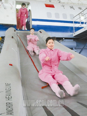 緊急撤離訓(xùn)練廳。廣播中傳出急促的警報(bào)聲,教員發(fā)出“緊急撤離”指令,此刻模擬艙內(nèi)濃煙彌漫,學(xué)員們立即行動起來,打開充氣滑梯,然后抬起雙手,將身體彎成90度直角跳出機(jī)艙,從滑梯上滑下。充氣滑梯大約有四層樓高,跳下去對一些膽小的人來說是需要勇氣的。楊麗忘不了自己剛開始的狀況。20歲的楊麗身材高挑,面容清秀,從小嬌生慣養(yǎng),是爹媽的掌上明珠。那天楊麗聽到老師發(fā)出“一、二、跳”的指令,雙腿軟了,眼淚奪眶而出,持續(xù)了三分鐘。老師大聲吼道:“楊麗,快跳!”面對四層樓高的滑梯和嚴(yán)厲的訓(xùn)斥,楊麗越發(fā)害怕起來。哭著懇求老師:“能不能不跳,我害怕……”沒等楊麗說完,老師便將她甩下機(jī)艙,這時(shí)楊麗雙手緊緊抓住艙門旁邊的鋼管,雙腳懸在滑梯上拼命地掙扎,大喊:“救命啊,救命啊!”現(xiàn)在她完全適應(yīng)了。