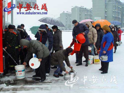受暖濕氣流和冷空氣的共同影響,25日以來,安徽省銅陵市再次出現連續性強降雪,氣溫也繼續下降,最低達零下4℃,全市出現了長時間的凝凍天氣。從26日上午開始,市內多條供水主管道相繼被凍結或爆裂,上萬居民陷入了無水可用的困境。銅陵市消防支隊及時啟動了雨雪災害搶險救援應急預案,先后出動4輛消防車、20余名官兵,冒著大雪和嚴寒,往返于取水點與居民區之間,為居民們送來了12車、共70噸清水,解決了居民們的燃眉之急。