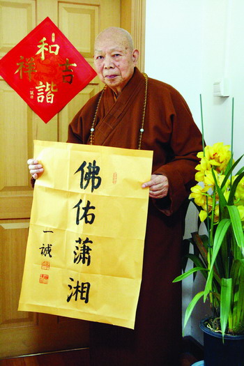 坐在北京廣濟寺中國佛教協會辦公室里,全國政協常委、中國佛教協會會長一誠大和尚不禁面露愁云,為家鄉湖南遭遇雪災而擔憂著。80高壽的一誠大和尚用稍微有點顫抖的手提起了筆,飽含深情地寫下了“佛佑瀟湘”四個大字,“祈愿家鄉湖南能永離災難,人們幸福安康”。為此他還準備為家鄉捐出5萬元。