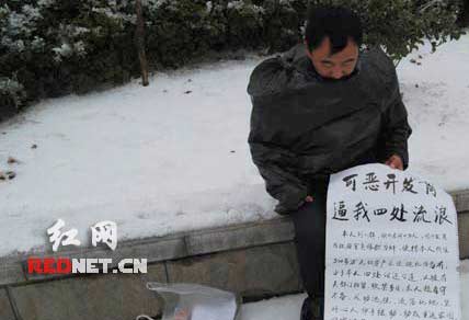 帖子陳述說,“1月29日,長(zhǎng)沙的街頭雖然冰雪封凍,但仍然掩蓋不了春節(jié)的氣氛,到處呈現(xiàn)出過年的景象。本人剛從超市里購物出來,發(fā)現(xiàn)了這令人心酸的一幕,就用攜帶的相機(jī)拍了下來。經(jīng)過筆者簡(jiǎn)單的問詢,照片中的人為湖北老河口市(屬襄樊市)的一公園游樂設(shè)施承包人,因?yàn)槿C俱全的房產(chǎn)被政府有關(guān)部門定性為違章建筑,而拒絕賠付,并對(duì)其所屬的房屋進(jìn)行強(qiáng)制拆遷,使其公道無處伸張,而流落街頭。”