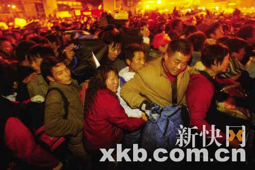 在站前路,記者費了九牛二虎之力用半個多小時才走到流花車站。到昨日下午3時許,一批武警戰士從該出口陸續通過后,中間大批乘客突然推搡前面乘客,結果洶涌的人流一發不可收拾,不但推開了所有護欄,數十名警察一下子被數千旅客組成的人潮吞沒。直到人走了大半,警戒線才恢復正常。