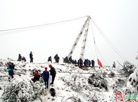 隨著災(zāi)情的進(jìn)一步加劇,萍鄉(xiāng)市人民政府在當(dāng)日下午18時(shí)隨即啟動(dòng)了大面積停電事故應(yīng)急預(yù)案Ⅰ級(jí)響應(yīng),市委書記謝亦森、市長(zhǎng)曾慶紅等市領(lǐng)導(dǎo)先后來到萍鄉(xiāng)供電公司,了解指導(dǎo)電網(wǎng)抗冰搶險(xiǎn)與電力供應(yīng)保障工作。供電部門也加緊了對(duì)受損電網(wǎng)的搶修。萍鄉(xiāng)巨大的災(zāi)情引起了省電力公司的高度重視。1月25日,省電力公司總工程師譚永香親臨萍鄉(xiāng),深入蓮花縣現(xiàn)場(chǎng)視察災(zāi)情,指導(dǎo)萍鄉(xiāng)供電公司做好抗冰搶險(xiǎn)保供電工作;1月30日,省電力公司黨組書記、總經(jīng)理毛日峰又委派了省電力公司副總經(jīng)理肖黎春火速趕往萍鄉(xiāng),坐鎮(zhèn)指揮和督導(dǎo);在1月24日調(diào)集了省水電工程局和武警水電總隊(duì)共180余名增援隊(duì)伍后,1月30日,省電力公司又調(diào)集贛州供電公司近30名精兵強(qiáng)將強(qiáng)力增援萍鄉(xiāng)。至此,加上萍鄉(xiāng)供電公司和贛萍公司的搶修人員,一共有近3000名電力員工投入到萍鄉(xiāng)電網(wǎng)抗冰保供電中。