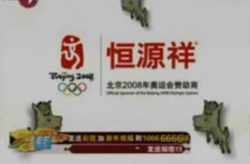 春節期間,中央電視臺、東方衛視、湖南衛視等播出恒源祥集團的賀歲形象廣告。廣告中,低沉的男聲反復12遍“恒源祥,北京奧運會贊助商。”童聲念出的十二生肖名稱穿插其間,從“鼠鼠鼠”、“牛牛牛”,直到“豬豬豬”。廣告畫面以奧運中國印和恒源祥商標為底,十二生肖的卡通圖案依次閃過。廣告時長1分鐘。