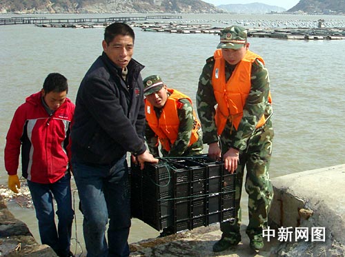 中新網溫州2月21日電(記者蔡儒恒 通訊員吳水兵)近日寒冷天氣持續,浙江省溫州市平陽縣南麂島網箱養殖遭受了近年來最慘重的損失,大量養殖魚被活活地凍死,受災的網箱達到1400個。目前,當地政府部門和邊防官兵積極幫助漁民轉移養殖網箱,將經濟損失降至最低。