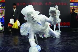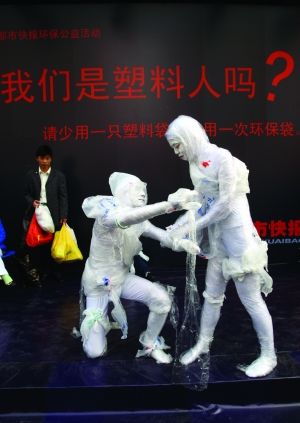 兩個(gè)被塑料袋緊緊包裹、渾身慘白的人,舉步艱難,倒在地上痛苦地掙扎;其他幾個(gè)外表正常的人,也不由自主地受到塑料袋的束縛,逐漸喪失行動(dòng)能力……昨天下午,在杭州東新園沃爾瑪超市門外的廣場(chǎng)上,一場(chǎng)由本報(bào)發(fā)起、杭州環(huán)保志愿者一起參與的、以“我們是塑料人嗎”為主題的現(xiàn)場(chǎng)行為藝術(shù),牢牢抓住了過(guò)往行人的眼球,他們圍了個(gè)里三層外三層,看清楚之后,發(fā)出這樣的驚嘆,“哦,原來(lái)是這樣的!”