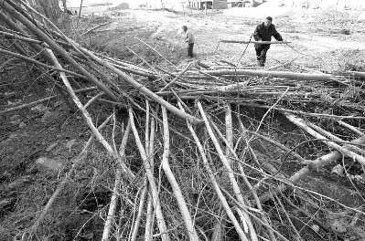 昨日下午2時,記者聞訊來到現(xiàn)場時,陳保民和母親、妻子正在被夷為平地的林地里整理楊樹的“斷臂殘肢”!昂煤玫囊黄瑯淞,一會兒工夫,啥都沒有了,造孽!”70歲的陳母抱著一把新鮮的楊樹枝,泣不成聲。
