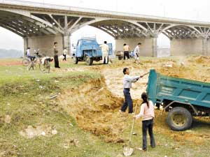 下午3時左右,兩輛微型卡車就在大橋南岸的橋墩旁進行挖砂,不到二十分鐘就裝了滿滿兩車開走了。據(jù)悉,今年以來河砂價格飛漲,“出廠價”從原來的每立方米十幾元漲到了現(xiàn)在的68元,只要挖一拖拉機的砂就能賺兩三百元。