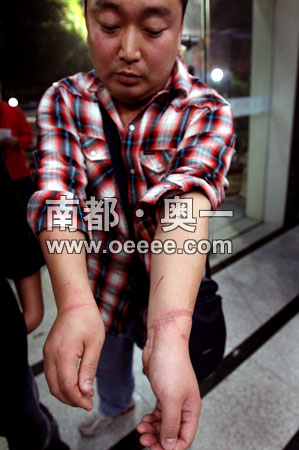 今日4時45分,馬小六被銬近兩小時后,在黃貝派出所所長劉臣建的指示下,該所警員將手銬打開。今日上午,多處受傷的南方都市報記者馬小六被鑒定為輕微傷。(高爽)