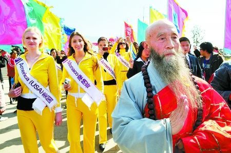 昨天上午10時(shí),滿載115名美女的大巴車停在了少林寺山門前,一位白須僧人雙手合十站在路中間,兩旁是8位身穿黃色袈裟的年輕僧人。看到旅游小姐迎面走來,白須僧人轉(zhuǎn)身在前帶路,8名年輕僧人分列隊(duì)伍兩旁。